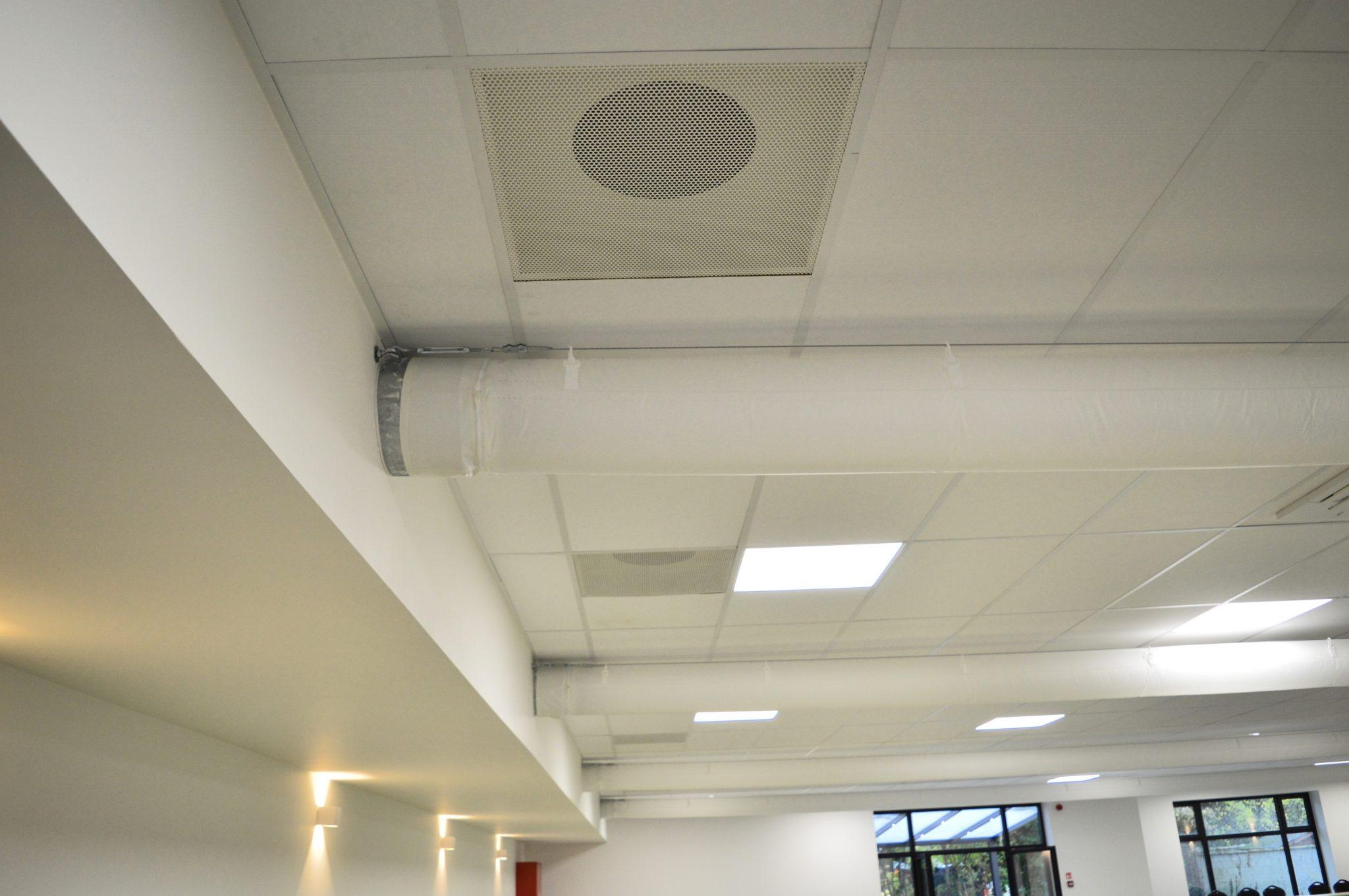Een feestzaal te Mechelen wordt van verse lucht voorzien door een RV3500 luchtgroep met warmtewiel en boven aansluiting. De klant koos terecht voor de pulsie te verdelen dmv textielkanalen. Textielkanalen hebben de eigenschap om de lucht gelijk te verdelen zonder tocht te voelen. De plannen, materiaal, opmeten van maatwerk en opstart werd door Sanutal uitgevoerd Het geheel werd geplaatst door een installateur die via Van Oirschot kocht.